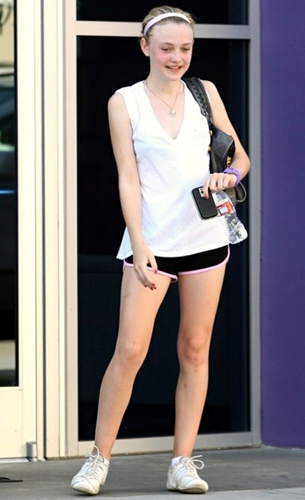 Dakota Fannig, 15, saliendo del gimnasio este fin de semana. La estrella adolescente se ha integrado al elenco de la película Luna Nueva; aquí ella luce espléndida en mini shorts.